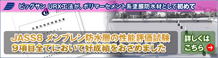 ビッグサン URX工法が、ポリマーセメント系塗膜防水材として初めて、JASS8メンブレン防水層の性能評価試験の全項目において好成績を収めました。