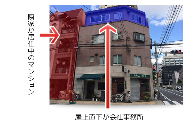 | 屋上 | アスファルト押さえコン +FRP防水 | 街中での工事のため、 ◎振動・騒音・臭気がないこと ◎FRPの上に施工できる仕様であること ◎通気仕様であること |