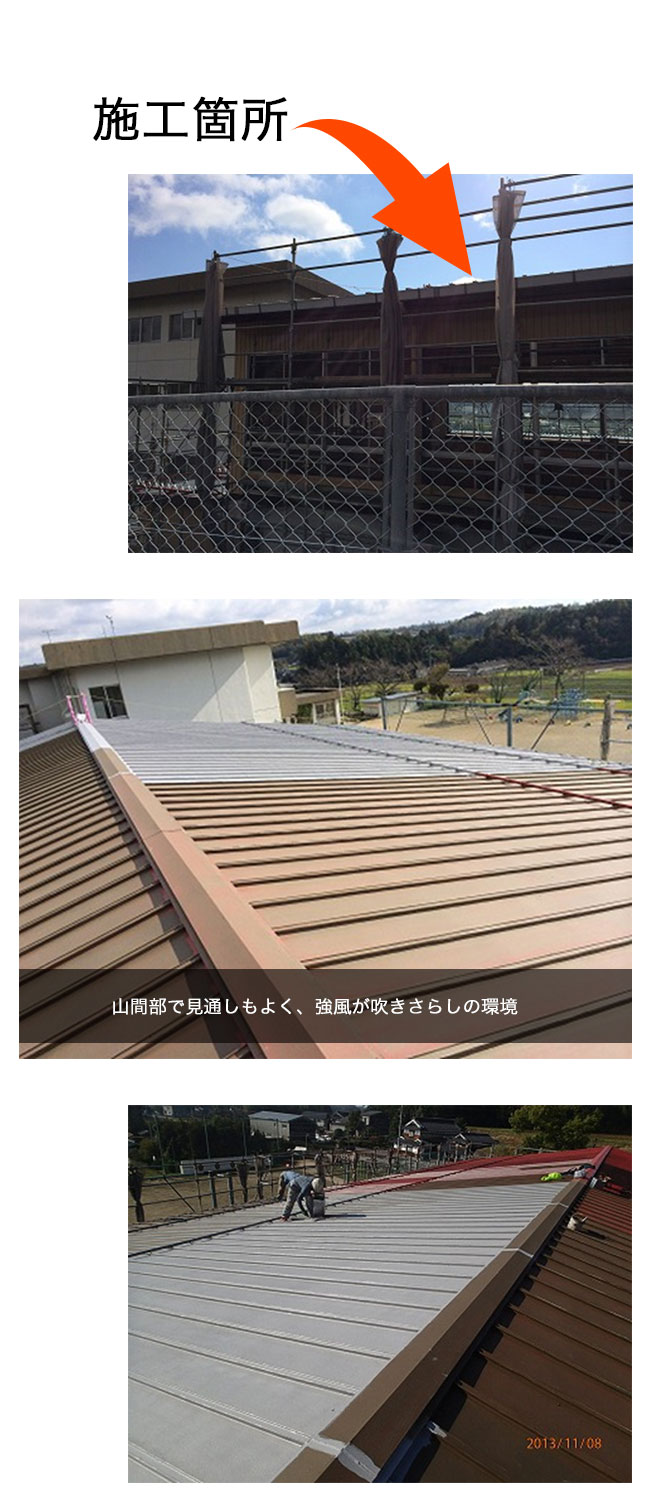 | 金属瓦棒屋根 | 塗装 | 施設使用中の工事のため、 ◎臭気が極力少なく、防水性能があること ◎手塗り施工が可能であること ◎遮熱性能があること |