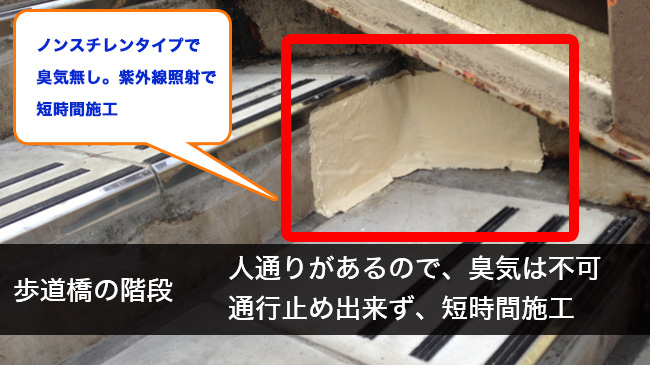 紫外線硬化型FRPシートでの補修が検討されていましたが、従来品は施工時にスチレンの臭気が漂ってしまい、上記のような環境では好ましくはないと議論されていました。