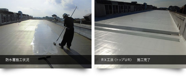そこで、大日化成の通気緩衝工法である、RX工法(トップUR仕様)が採用となりました。通気緩衝工法であるので、下地からの水分などを放出することができるのと、工場ですので内部では天井クレーンやリフトが右往左往に巡らされており、それらの振動にも対応が可能です。