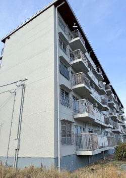 広島県内の県営住宅改修工事でベランダ・庇箇所の防水改修を行う事になり、ポリマーセメント系塗膜防水工法「ビッグサンRA−4工法」が採用になりました。