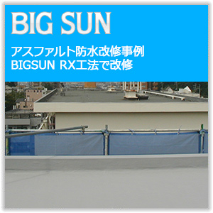 アスファルト防水の上には塗膜防水。かつ、オール水系で施工可能で下地の動きにも追従可能。そして通気緩衝で下地からの水蒸気吐出にも対応出来る、ビッグサンRX工法
