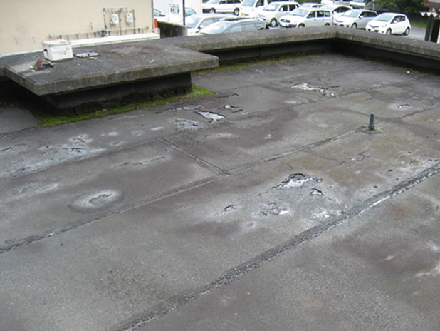 既存の屋上防水は露出アスファルト仕様。亀裂や膨れが目立ち始め、表面温度の上昇による劣化も進んでいました。