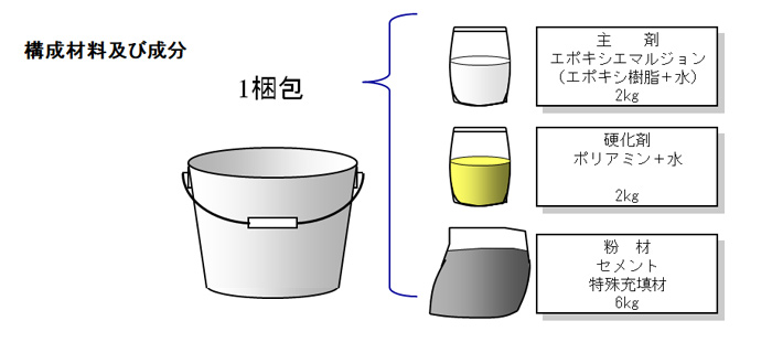 製品構成はエポキシエマルジョンを主成分とする主剤、ポリアミンを主成分とする硬化剤、セメントプレミックス粉材の3材セットとなります。