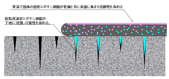 常温で固体である固形エポキシ樹脂と高浸透且つ低粘度の液状エポキシ樹脂をうまくブレンドすることで吸い込みの大きい下地に対しても安定した性能を確保することが出来、又、早期に次工程に入れる早期表面強度発現性を実現させています。