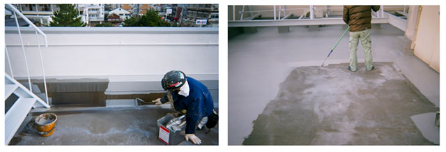そこで提案したのが、ポリマーセメント系塗膜防水材「ビッグサンRB-6工法」です。最大の特長は、下塗り・防水材・トップコートの全工程が水性であるという点。臭気がほとんど発生せず、施工時の騒音も極めて少ない。まさに、今回の条件に適した工法です。