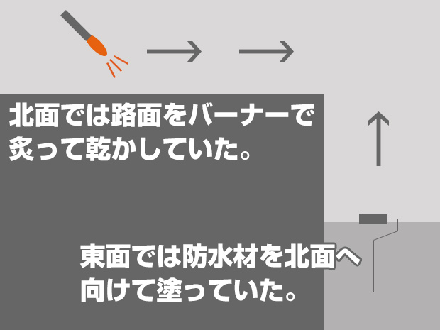 大きな現場になると複数の業者が工事を請け負いますが、同じ建物の北側工事現場では前日雨が降ったため塗面が塗れていたことから、コンクリートをガスバーナーで炙って乾燥させていました。一方東側の現場では予定通り防水材の施工をおこなっていたところ、その有機溶剤系の防水材料へ北側面で使用していたバーナーの火が引火し火災となりました。