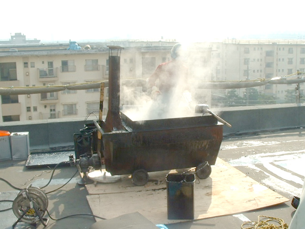 アスファルト防水の溶融釜から発火し延焼したり、溶剤等に使用される発火物に引火したり、有機溶剤系の防水材を混練する際に使用法を誤り発火してしまったりと、意外に防水工事に起因する事故が起きています。