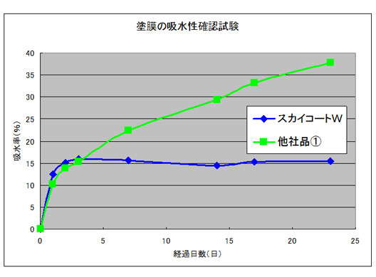 吸水性が高いと防水膜に水か浸透してしまいます。そうなってしまうと、防水膜が白濁してしまいますので、下地面の意匠を損ねてしまいます。スカイコートWはこの吸水性にも配慮して開発されているので、長きにわたり透明を維持して下地の意匠性を損ねにくくなっております。