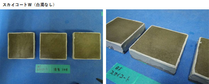 試験片はモルタルで、7日間も水につけていることから、モルタル側からの浸水もあり、塗膜面の裏側からも水分が流入しているわけですが、それでもスカイコートWは白濁していない結果となりました。
