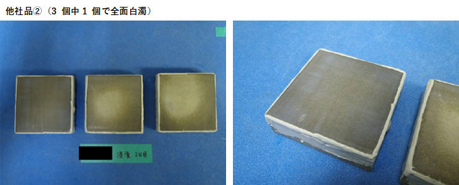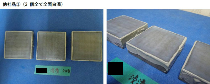 | 他社品 A | 3個中2個で面積 の1/4程度白濁 | 3個全て全面白濁 |