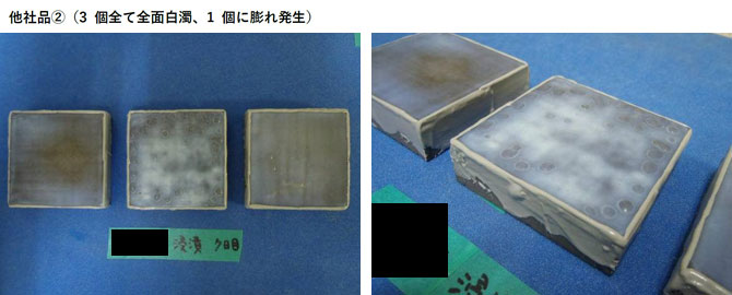 | 他社品 B | 3個中1個に全面白濁 | 3個全て全面白濁1個に膨れ発生 |