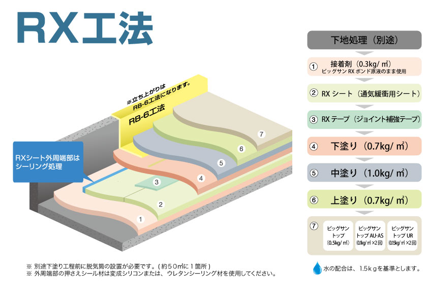 | ビッグサン RB-6工法 日本建築学会 ポリマーセメント系塗膜防水工事施工指針(案) PA-2仕様 適合 |