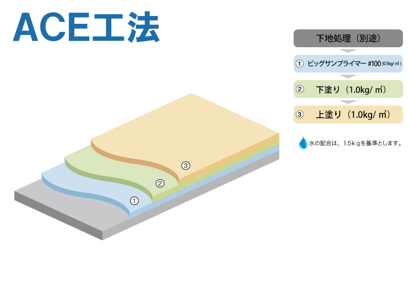 | ビッグサン ACE工法(フリーアクセス/OAフロアー専用工法) 日本建築学会 ポリマーセメント系塗膜防水工事施工指針(案) PA-1仕様 適合 |
