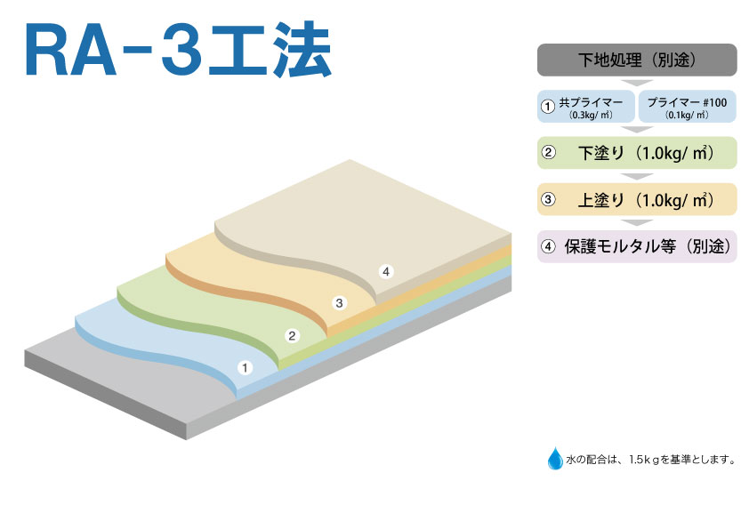 | ビッグサン RA-3工法 日本建築学会 ポリマーセメント系塗膜防水工事施工指針(案) PA-1仕様 適合 |