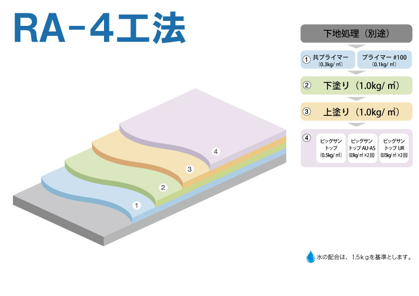 | ビッグサン RA-4工法 日本建築学会 ポリマーセメント系塗膜防水工事施工指針(案) PA-1仕様 適合 |