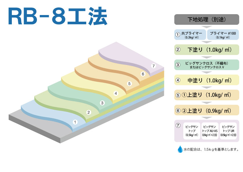 | ビッグサン RB-8工法 日本建築学会 ポリマーセメント系塗膜防水工事施工指針(案) PA-3仕様 適合 JASS 8 M-103-2022 M-104-2022 C_PF仕様 |
