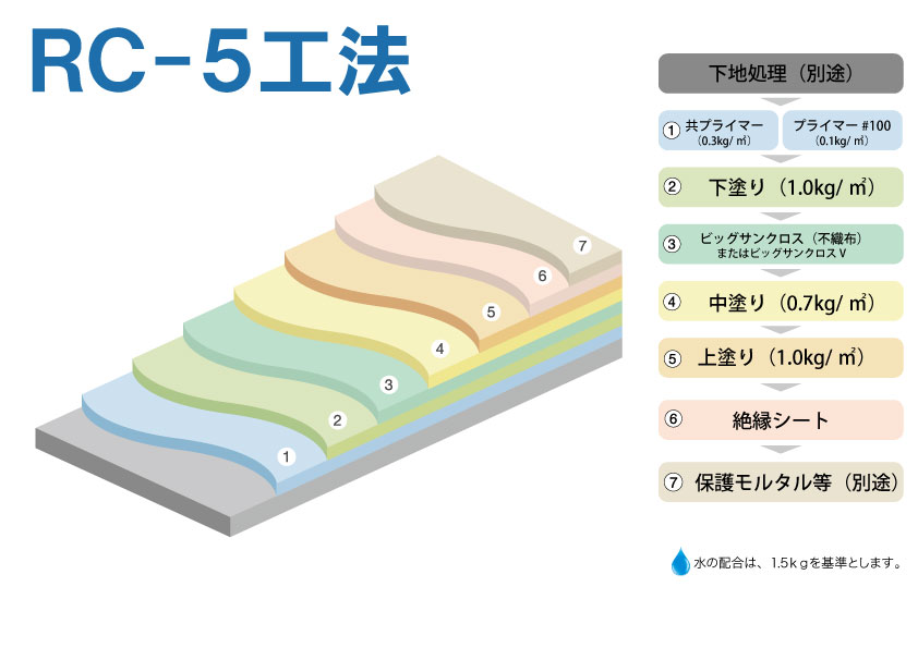 | ビッグサン RC-5工法 日本建築学会 ポリマーセメント系塗膜防水工事施工指針(案) PA-2仕様 適合 |