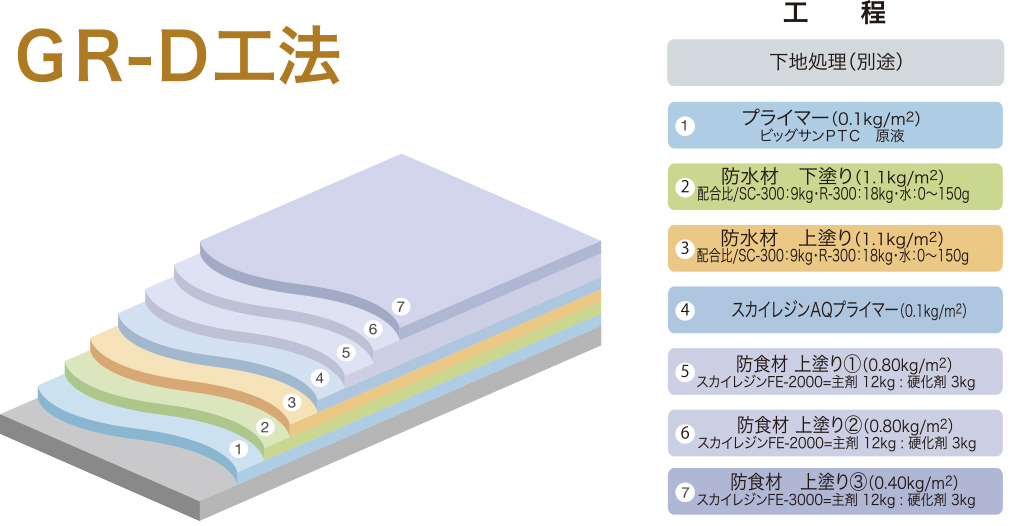 | GR-D工法 日本建築学会 ポリマーセメント系塗膜防水工事施工指針(案)PB−1仕様 適合 JASS 8 M-103-2022 C-PU仕様 |