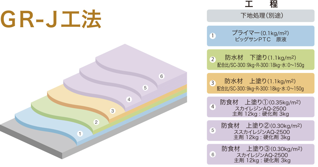 | GR-J工法 日本建築学会 ポリマーセメント系塗膜防水工事施工指針(案)PB−1仕様 適合 JASS 8 M-103-2022 C-PU仕様 |