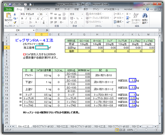 左上の方にある、【施工面積】の文字の横に知りたい施工面積を入力し、