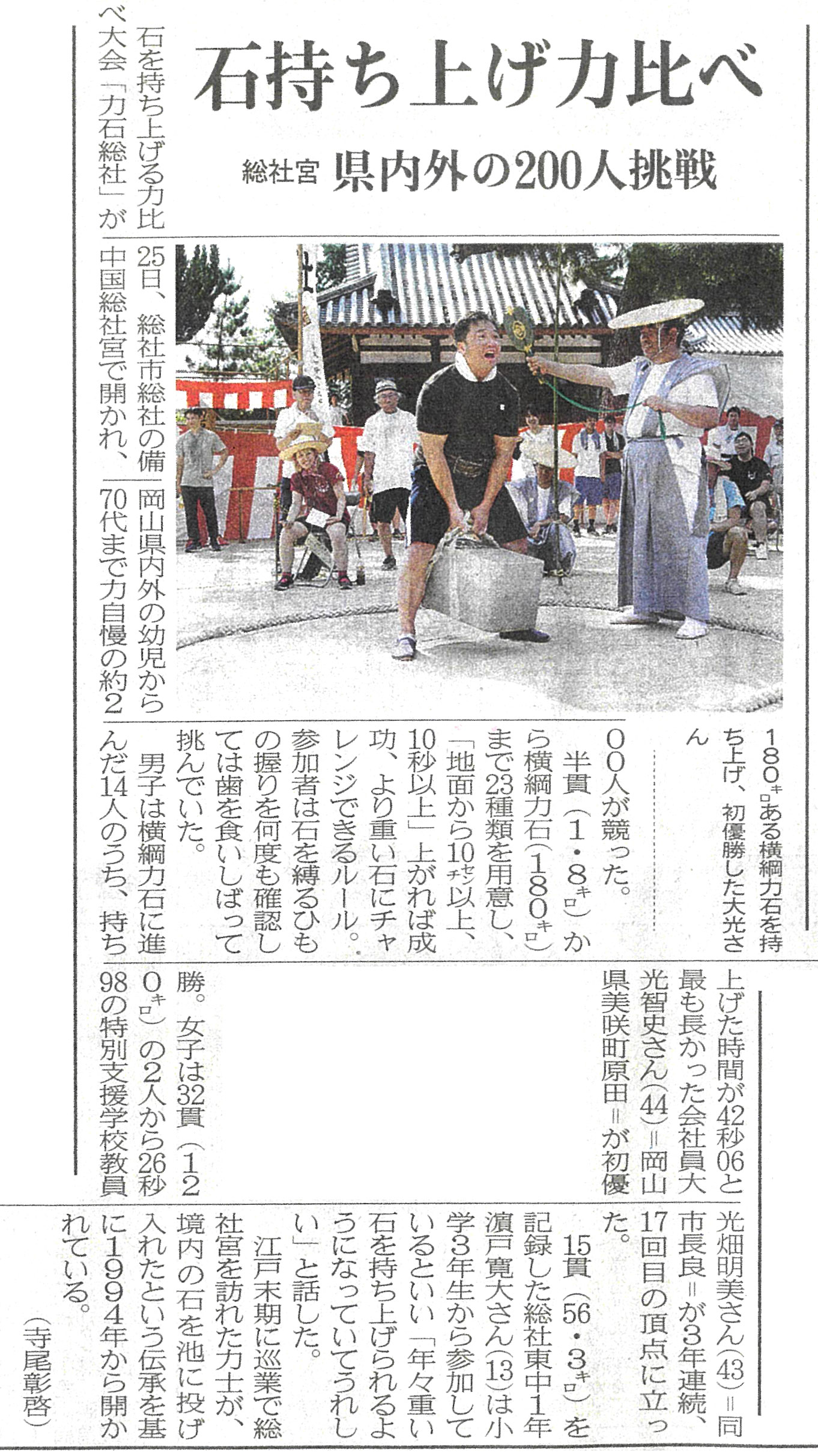 石を持ち上げる力比べ大会「力石総社」が総社市総社の備中国総社宮で開かれ、持ち上げた時間が42秒06と最も長かった弊社 技術部に勤務する「大光智史」が、優勝しました。