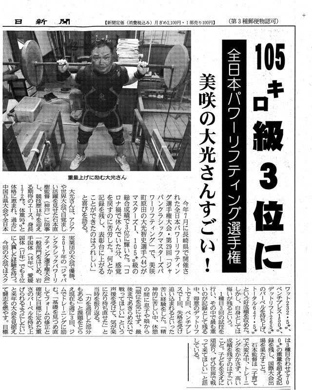 全日本パワーリフティング選手権大会・第29回「ジャパンクラシックマスターズパワーリフティング」で、弊社 技術部に勤務する「大光智史」が、総合3位に。